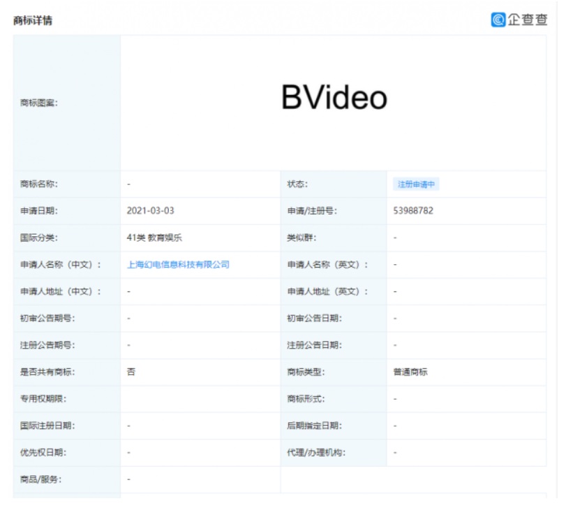3月8日消息 企查查 APP 显示,B 站关联企业上海幻电信息科技有限公司于 3 月 3 日申请注册 “BVideo”、“bilibili 影业”等商标,涉国际分类教育娱乐、广告销售等,商标状态为注册申请中。