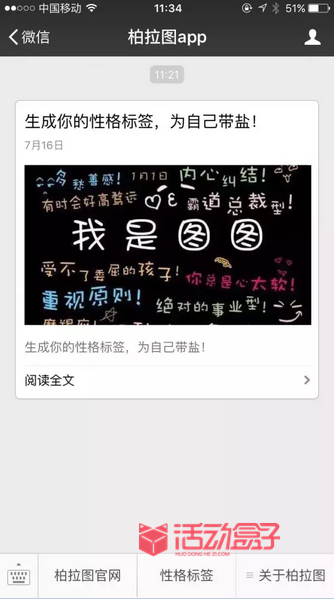 就在前不久,7月16日,柏拉图app推出的个性标签H5活动刷爆朋友圈。柏拉图微信公众号一夜之间吸粉数百万,微信推文不仅10万+,在公众号被封之前,后台留言点赞数超过3万+。柏拉图app应用也一跃在在app store中社交(免费)榜单中从150名开外一跃到了25名。虽然,最后因为有诱导分享的嫌疑,微信公众平台被腾讯封杀,但柏拉图app此次的推广活动无疑是成功的,为其带了无数新用户。