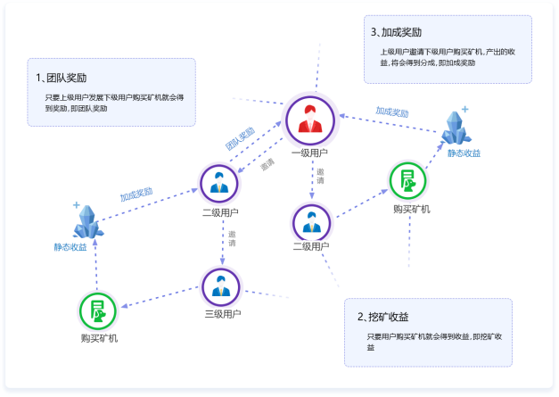 只要上级用户发展下级用户购买矿机就会得到奖励,即团队奖励。
